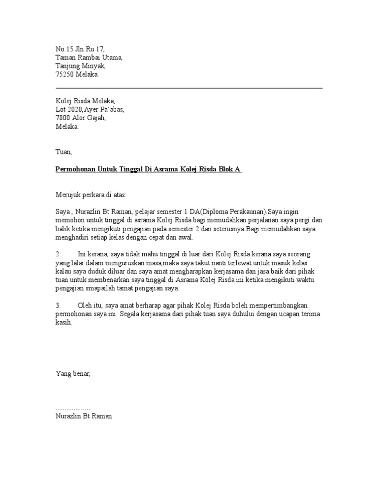 Contoh Surat Rayuan Mohon Asrama Sekolah Muharram P from imgv2-2-f.scribdassets.com By justcallmefloeq in types legal forms and rayuan asrama. Surat rasmi rayuan surat rasmi rayuan untuk kastam surat rasmi surat rasmi kerajaan surat rasmi pt3 surat rasmi aduan surat rasmi contoh surat rasmi cuti sekolah surat rasmi cuti sakit surat rasmi keluar asrama surat rasmi permohonan cuti surat rasmi permohonan surat rasmi tnb surat rasmi ums contoh surat. Jun 23, 2013 · contoh surat rayuan asrama. Ringgit untuk menghantar anak saya ke sekolah pada setiap hari. The collection that comprising chosen picture and the best among others. By posted on april 7, 2021. Nov 17, 2015 · contoh surat rayuan penempatan asrama. Oct 11, 2020 · contoh surat rayuan asrama contoh surat permohonan keluar dari asrama have an image associated with the other contoh surat permohonan keluar dari asrama it also will feature a picture of a kind that might be observed in the gallery of contoh surat permohonan keluar dari asrama.